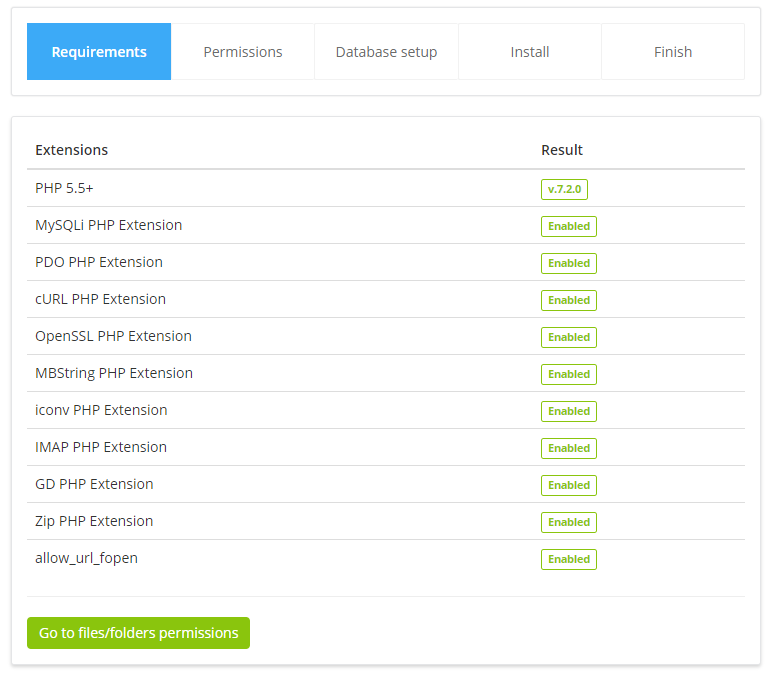 If all server requirements passed click Go to Files/Folders Permissions otherwise consult with your hosting provider to fix/enable them.